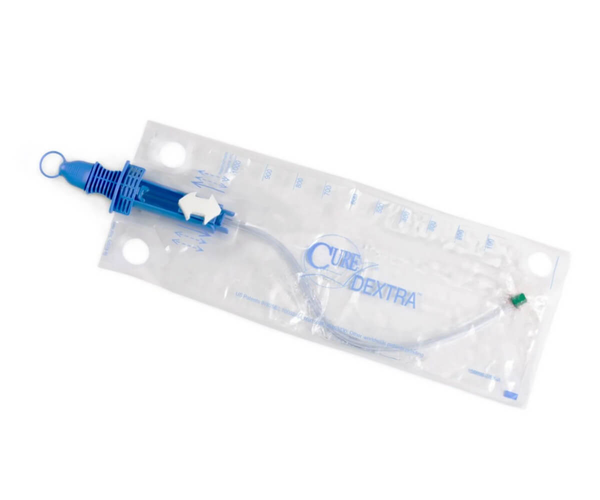 Cure Dextra® Closed System Catheters are unisex catheter products with helpful, innovative features that make it easier for anyone to cath at home or on the go! It may be especially helpful to catheter users with limited hand dexterity. The Cure Dextra® Closed System Catheter features a unique Support Band that allows you to control the catheter with one hand. The touch of a finger or thumb helps slide the unique Gripper Arrow™ forward to advance the catheter without retracting back inside its self-contained urine collection bag. This pre-lubricated no-touch catheter also features the unique Cure ProteX Introducer Tip™, which may help reduce the risk of UTIs (urinary tract infections). For more information or to request free samples, contact our Catheter Specialists at 180 Medical today!